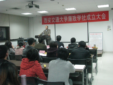 的第165个学生社团,廉政学社主要是由博士、硕士研究生组成,具有较高的学术层次;“新”是指在理论界正积极探索如何更好地进行反腐倡廉工作的形势下,我们成立了该学社,并希望能为之提供深厚的理论支撑和有效的实践支持。李老师还对学社如何开展日常活动,以及学社成员如何处理专业课学习与社团活动之间的关系给予了具体的指导。