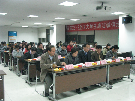 按照会议议程,在大会上宣读了廉政学社章程并选举产生了学社执行机构的负责人。本次大会还进行了首届12.9全国大学生廉洁诚信知识竞赛活动启动仪式,学社相关负责人对活动的基本情况和评奖细则做了介绍,随后由受邀嘉宾向参会的各书院负责人发放了竞赛答卷。