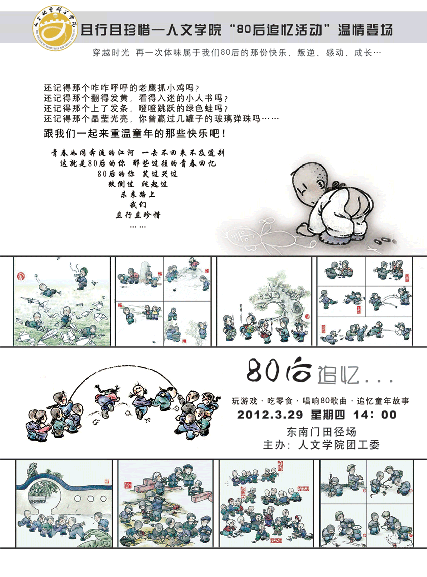 黑料网 团工委将于本周四(3.29)下午2:00在东南门田径场举办“80后追忆活动”,欢迎各位师生积极参加。