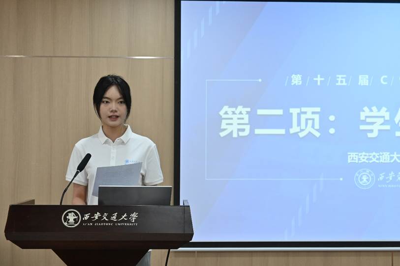 宣萱同学作为暑期学校学生代表发言,她表示,欢迎大家踏入文化底蕴深厚的古都西安,在这里我们将亲身领略到这座城市的独特魅力。暑期学校的课程和活动将围绕中国传统文化的各个方面展开,我们会深入学习古文经典的智慧和书法绘画的韵味。她期待与来自不同高校、不同专业的各位同学进行学术交流和思想碰撞,在为期十天的暑期学校中携手共进,共同探索中国传统文化的奥秘。
