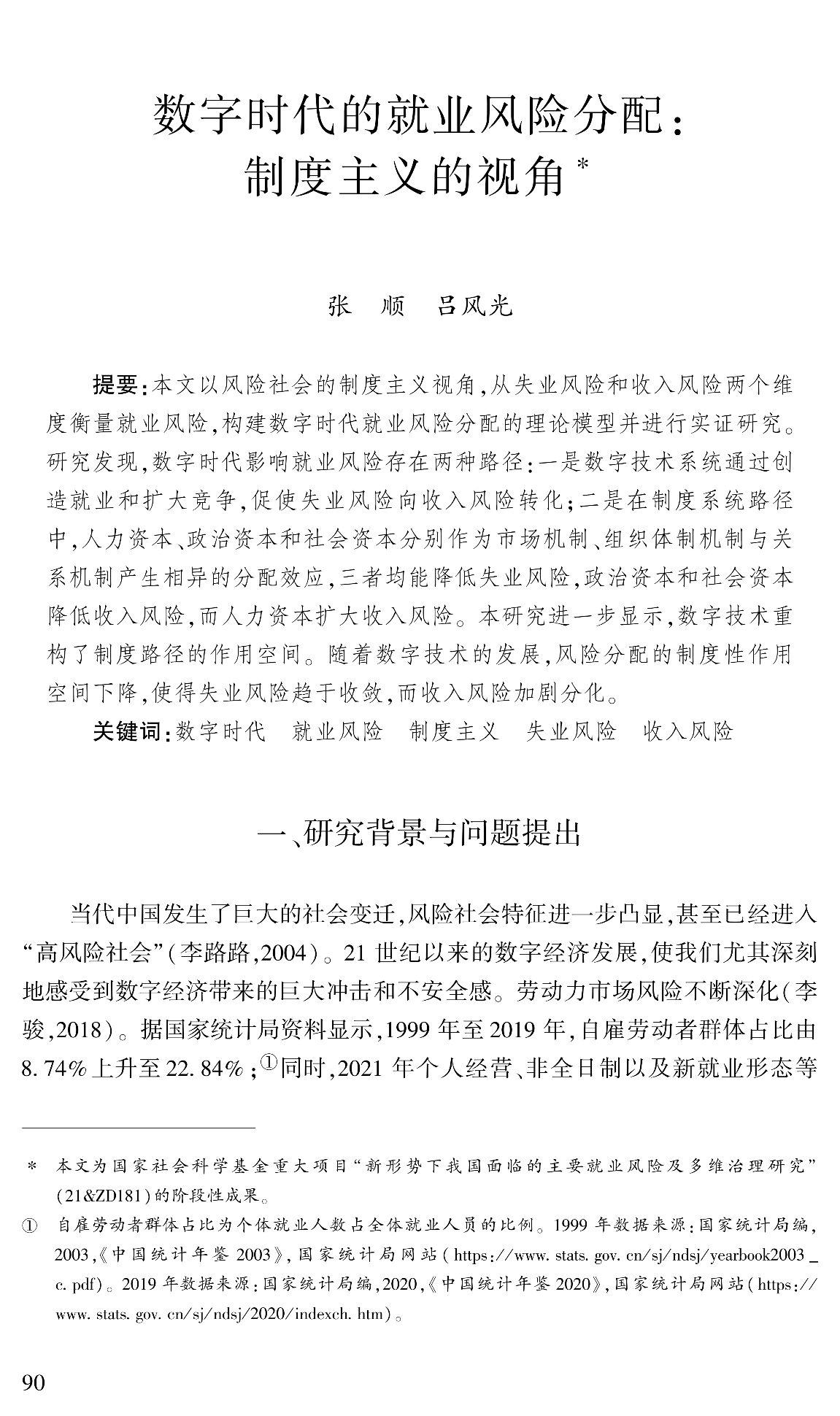 数字时代以前所未有的力度与速度重塑就业形态与就业结构,系统性扩张了就业风险及其不平等,成为新时代面临的新问题。张顺与吕风光的研究聚焦于数字时代劳动者的就业风险及其分配机制,从失业风险和收入风险两个维度衡量就业风险,构建数字时代就业风险分配的理论模型并进行实证研究。研究发现,数字时代影响就业风险存在两种路径:一是数字技术系统通过创造就业和扩大竞争半径,促使失业风险向收入风险转化;二是在制度系统路径中,人力资本、政治资本和社会资本分别作为市场机制、组织体制机制与关系机制产生相异的分配效应,三者均能降低失业风险,但政治资本和社会资本降低收入风险,而人力资本扩大收入风险。数字技术重构了制度路径的作用空间,随着数字技术的发展,风险分配的制度性作用空间下降,使得失业风险趋于收敛,而收入风险加剧分化。