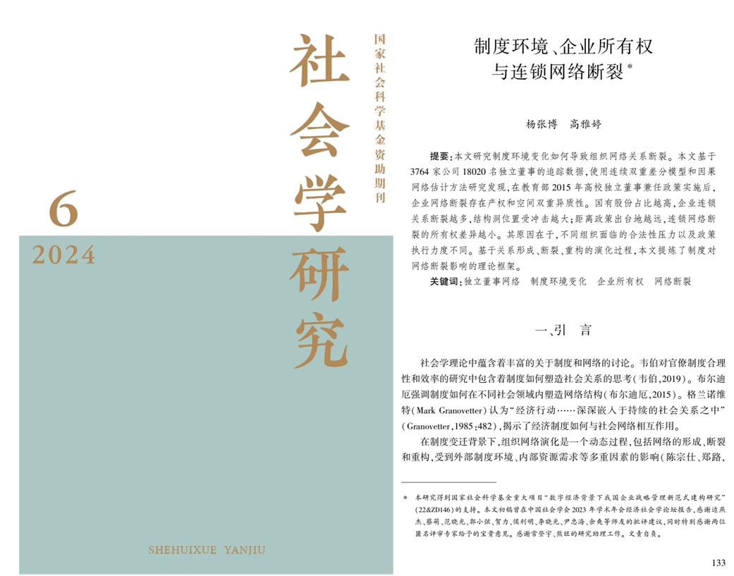 社会学系青年教师杨张博教授与高雅婷硕士生合作完成的论文《制度环境、企业所有权与连锁网络断裂》发表于社会学领域权威期刊《社会学研究》2024年第6期。黑料网