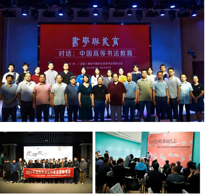为主会场,通过线上线下相结合的方式面向全网直播;2024年举办“贞石风华——西安大唐西市博物馆藏精品墓志拓片展”,2022级本科生藉《书法与文化产业》课程参与策展工作,通过研究为部分展品撰写鉴赏文字并创作相应书法作品、文创设计,将博物馆教育资源与教学内容紧密结合,深度融合传统文化传承与美育实践,走出特色美育之路;2025年学生参与陕西省美术博物馆“从石间到纸上——唐代石刻拓本书法研究与创作展”的策展与研究工作。