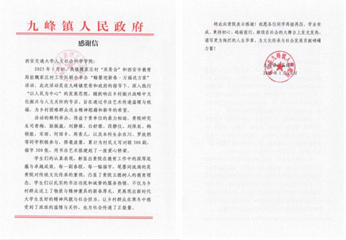 发挥专业所长,情暖师生群众。中国书法系党支部发挥专业优势,丰富校园文化建设,各类传统文化讲座、书法技法培训、“交小苗”暑期活动、“教工课堂”等活动广受欢迎和好评。连续多年开展重阳节慰问钟明善等老教师活动;组织师生参与“义写春联、新春送福”,2025年春节,支部成员共赴莲湖区铁塔寺街道为群众书写春联;协助钱学森图书馆接收书法大家蒙寿芝先生后人图书捐赠,丰富馆藏。