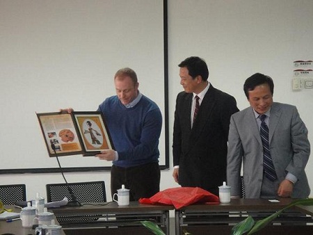 David Burgess 教授和边燕杰教授代表两校互赠了礼物,将两校的友谊向前推进了一大步,为双方的进一步合作奠定了基础。最后,边院长邀请客人参观我校校史博物馆及春意盎然的交大校园,座谈会在友好的欢笑声中结束。