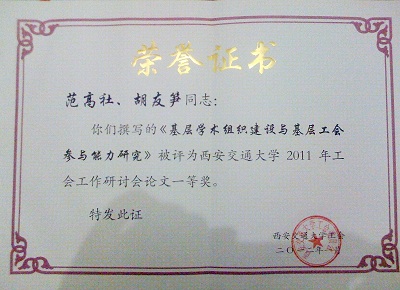 工会工作研讨会”上,我院工会主席范高社、工会宣传委员胡友笋老师提交的论文《基层学术组织建设与基层工会参与能力研究》获得优秀论文一等奖。