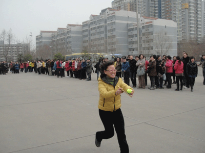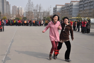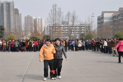 女教工在工会主席范高社老师的带领下,在工会副主席童梅老师和女工委员常龄方老师的精心组织下参加了本次校工会举办的趣味运动会。本次运动会共有三个集体项目:跳大绳、乒乓球拍托网球迎面接力和双人3足绑腿迎面接力,这些项目集竞技性、趣味性,协作性于一体。