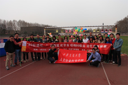 整个活动现场共分为三大区域,“80后回忆馆”、“80后照相馆”和“80后游乐园”。五彩气球装点下的“80后回忆馆”向大家展示了童年时期那色彩斑斓的稚趣和回忆:小巧灵动的绿皮蛙;五颜六色的粘牙糖;排排整齐的泡泡胶;超萌可爱的套水圈……不时引来同学们竞相参观和声声惊叹。“80后照相馆”则盛大开业,为今天前来参加游戏的同学们拍起了照片。最为热闹的当属“80后游乐园”,同学们热情似火地玩起了童年的游戏,一时操场弥漫着童年的温馨,化为了笑声的海洋。跳大绳游戏一开始,同学们个个神气十足,速度和动作不减当年风采,顿时场外一片欢呼和祝贺声;在接力跑游戏中,同学们自行组队,个个摩拳擦掌,队员们手握“火腿肠接力棒”,似离弦的箭跑得飞快,在相互配合和传递中,荡漾起童年的欢乐;“摸妃子”更是将现场气氛推向了高潮,“皇帝”身手矫健,“张牙舞爪”地摸着“妃子”,不时有人难逃“魔抓”终究落网,场外的观众爆发出雷鸣般的笑声,不禁拍手叫好……除此之外,同学们“一拥而上”,更是以抽奖的方式赢得了诸多大奖,吃着久违的泡泡糖,玩着超萌的套水圈,感受到的全是童年的味道。整个活动最终在快乐、温馨的氛围中圆满结束。