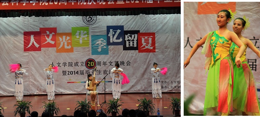 接下来的节目也同样令人拍掌叫好,来自艺术系的毕业生带来了《鸿雁》、《天高地厚》等经典曲目,西安外国语学院带来的《且吟春雨》以及我院师生合作演出的琵琶舞《青花瓷》,舞姿曼妙,让观众随之梦回那烟雨朦胧的告别年代。最后,晚会在一曲无伴奏合唱《彩云追月》中落下帷幕,余音袅袅,沁人心脾。