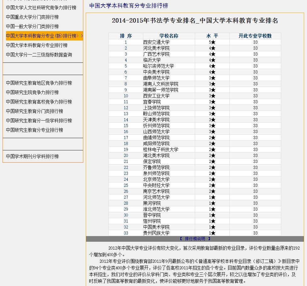 书法专业在2014-2015年中国大学本科教育分专业排名中喜获佳绩,消息来源于中国科学评价中心,首次发布发布时间为2014年1月16日,附网站查询结果链接://www.nseac.com/html/261/645980.html。