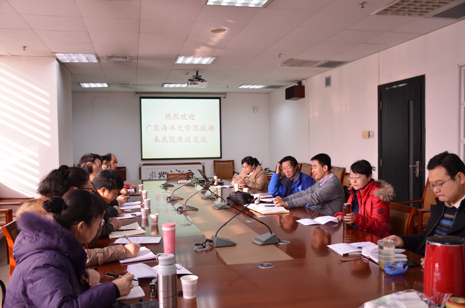 2015年1月7日上午,广东海洋大学思政部主任宋玉忠教授一行六人来我院交流。我院党委副书记宋永平、副院长燕连福、思政所所长范高社、历史所、马原所、政治学系部分教师和博士生代表参加了座谈会,座谈会由燕连福副院长主持。