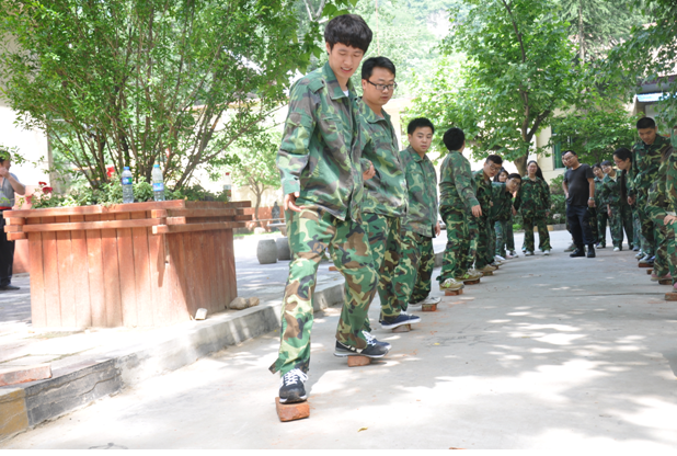 早上八点半户外拓展训练正式开始。同学们纷纷换上营地提供的迷彩服,个个精神抖擞,听候教练员的指挥。