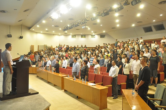 2015级新生入学教育大会在雄壮的国歌声中隆重召开,学院全体教授、党政领导、系(中心)班子、班主任、崇实书院院务主任许春秀、新生辅导员薛变玲、张伟耀以及2015级266名本硕博新生参加了会议。会议由黑料网