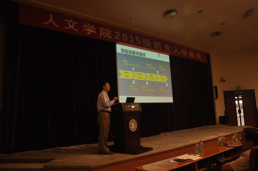 各系所主任也从系所概况、师资队伍、毕业生去向等几个方面向新生介绍了各个专业的情况。哲学系的张帆教授强调了哲学学科体系和人才培养体系的完备性,拥有多个二级学科,热切希望有兴趣的本科生能进入哲学系学习;社会学系的张顺教授则用详实的数据,介绍了社会学系的师资队伍情况、学生就业及科研成果现状,展示了社会学良好的发展现状和态势;中文系李明德教授以优美的文学语言向大家展示了选择学习中文的魅力及其重要意义;艺术系的张伏虎教授介绍了艺术系的发展以及艺术系毕业生们大好的就业、创业现状和前景,希望同学们能在艺术系学有所获、学有所成;书法系薛养贤教授富有激情的向大家展示了书法专业的魅力,他希望书法系的学生能把书法作为职业的同时,更要作为事业去追求。