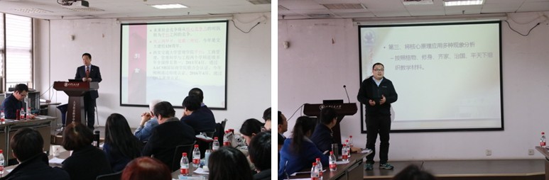 核心课团队的童梅副教授从教学改革、制度建设、未来展望、存在问题等方面介绍了《社会学概论》课程,并重点介绍了他们在翻转课堂方面实施的改革。喻丰教授重点介绍了《心理学基础》不以案例教学为荣,不以过度解释为荣,不以知识阐述为荣和不以悲苦工匠为荣的学科性质,李娟副教授介绍了“中国传统文化”课的在国内各大平台上线的情况,这是我校有近20年历史的重要的核心课。