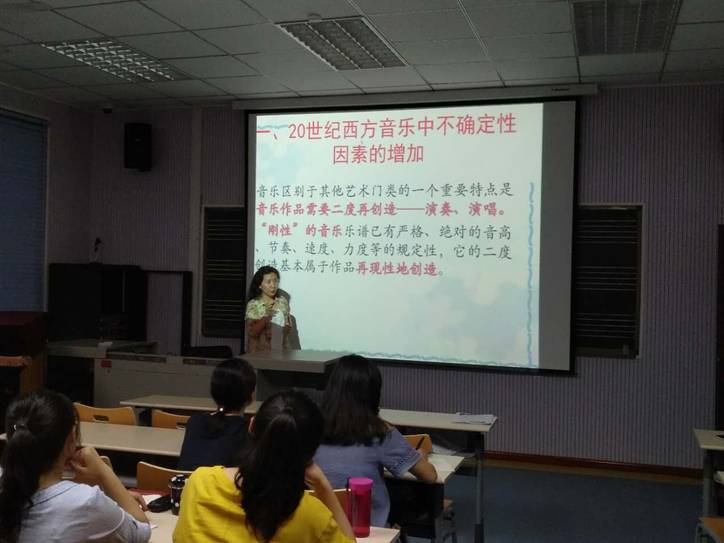 随后,曹耿献副教授从“20世纪西方音乐的转向——有序和无序的兼容”谈到了中国音乐在创作理念上客观上是先于西方音乐的,并针对影响中西方音乐发展的文化土壤、政治经济因素与在场的老师和同学们作了深入探讨,曹老师以土耳其进行曲为例,给同学们深入浅出的讲述了20世纪西方音乐刚性与柔性的兼容,并通过一些音乐实例,给同学们讲解了不同时期音乐的内涵,曹老师这种“乐器和创作背后的故事”的叙事手法,使在场同学们接受了一次难能可贵的审美教育,并引发了同学们对传统文化发展和创新的深入思考。