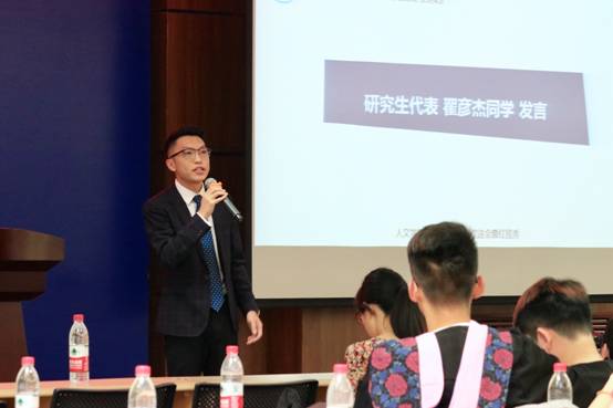 上午九点四十五分,主持人崔可嘉宣布毕业欢送典礼正式开始。第一项是由学生代表发言。本科生代表陈玲同学首先进行了发言,她回顾了整个大学四年的时光,并说至今还记得军训时大家挥洒汗水的样子,十分感谢这四年来老师们的谆谆教诲和父母的牵挂与陪伴。接着研究生代表翟彦杰同学进行了发言,他回顾了自己在研究生阶段,作为兼职辅导员和研究生会文体部部长,参与了很多工作,并且每一项工作都是他所热爱的,在这段读书生涯中,他不仅收获了知识和学问,更得到了锻炼,十分感谢自己的父母,师长,塑造了更优秀的自己,并带着满满的收获走上新的人生旅途。