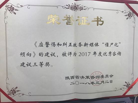 近日,政务新媒体研究中心陈强副教授和李明德教授提写的咨询建议《应警惕和纠正政务新媒体“僵尸化”倾向》荣获2017年度优秀决策咨询建议三等奖。这是政务新媒体研究中心持续关注陕西省政务新媒体建设的重大理论和现实问题,开展课题研究和战略咨询,建言献策取得的新的可喜的成绩。
