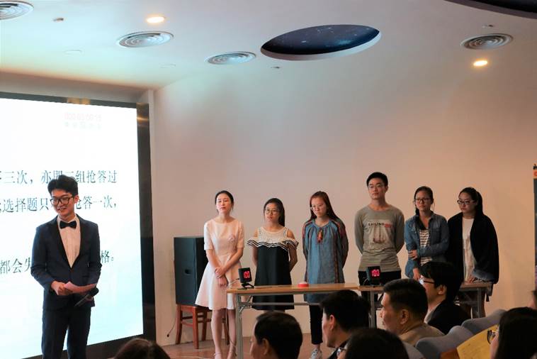第二轮“明辨是非”。由主持人念出一段100-200字的人物小记,其中包含3-5个错误,参赛队伍在主持人的念白过程中一旦发现错误,可以随意抢答。若错误没有被全部找出,选手可思考15秒,超时答不出则此题结束。本轮结束后,主持人开启了备受期待的抽奖环节,三位幸运观众获得了大赛礼品,包括交大定制本,定制笔及小米手环等,现场的紧张氛围在抽奖环节得以纾解。