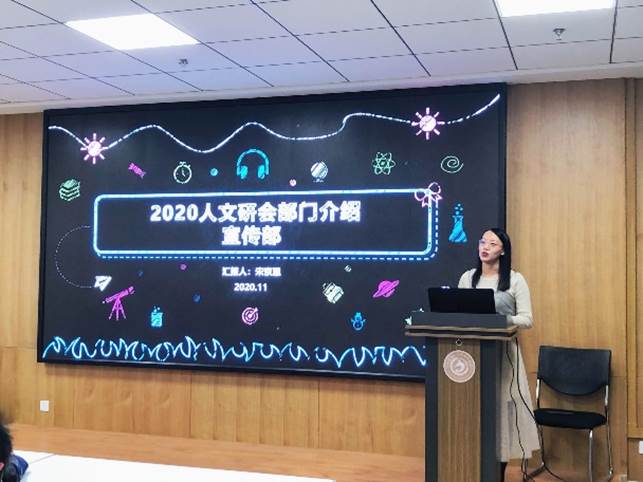新媒体中心负责人宋京恩分别介绍了宣传部和“人文交大”工作室的各位成员,她希望能在未来的工作中,面向同学积极开展公众号推送制作、海报设计等实用技能培训,并紧随时代潮流,创新宣传方式,努力做出更加吸引读者,图文并茂的宣传内容。