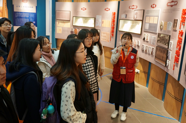 在讲解员的带领下,同学们依次参观了溯源、西迁和致远三个展馆。通过高举工业救国旗帜(1907-1920)、交通大学的崛起(1921-1937)、烽火岁月的奋进(1938-1949)和服务国家工业建设(1949-1955)等多个历史时期来了解交大创办的历程,涵盖了教育、文化、就业等多个方面。