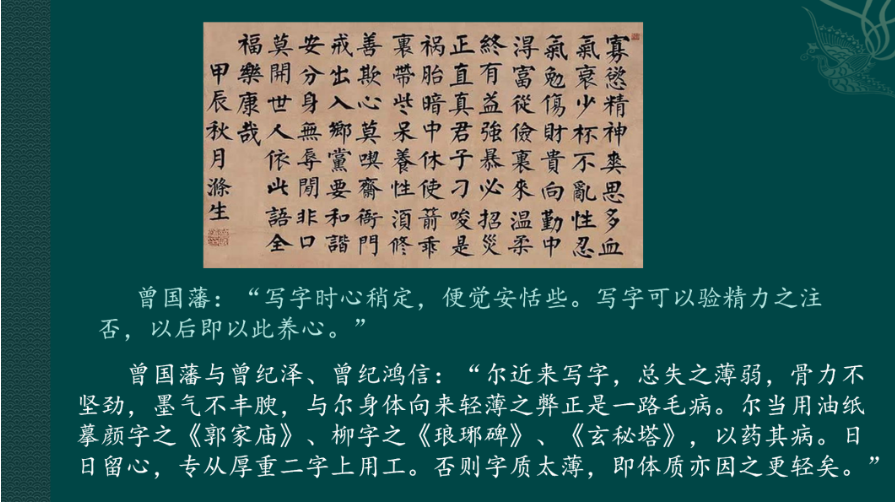 此次专题内容也是一次将中国传统书法艺术与课程思政相结合的尝试。中国书法是中华文化最凝练的物化形态,一件件书法作品凝结着人们的精神观念和审美理念,是书写者学识、才华、志向的综合反映。开课伊始,王劲老师即点题道:我们学习书法非常关键的一点是了解书法背后所蕴含的观念、以及作者的立意与志趣;人们对书法家的要求则是德艺并重,以德为先,因此学习书法就特别需要注重道德修养与品格提升。