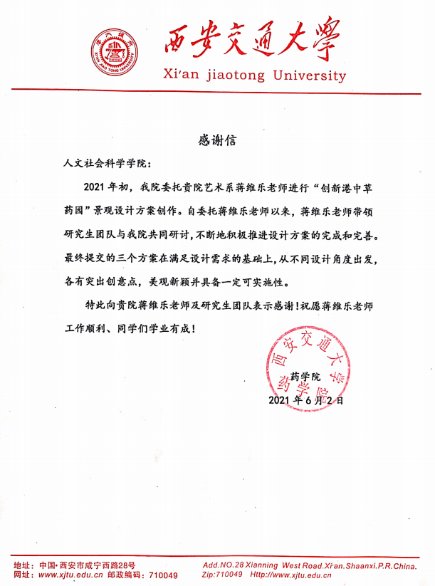 药学院委托我院艺术系蒋维乐老师进行“创新港中草药园”景观设计方案创作。信中对蒋维乐老师及带领的研究生团队对于“创新港中草药园”景观设计顺利完成方案的努力表示感谢。