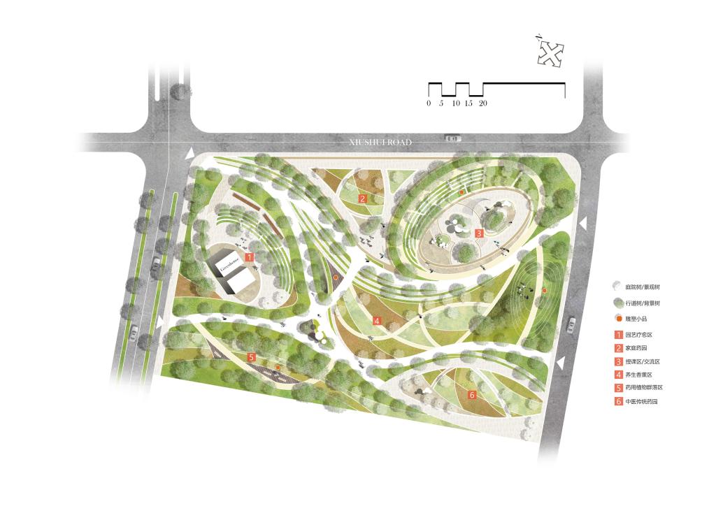 药学院表示自委托蒋维乐老师以来,蒋老师带领研究生团队与药学院共同探讨,积极推进设计方案的不断完善。创新港中草药园位于创新港东部1号绿楔南段,地势平坦,周围有梧桐中舍及创新港医院,占地约19亩左右。建设一个结合药用植物特征与景观疗愈功能,打造具有休闲游赏、放松身心及科普教育的校园植物园是本次设计的重要任务。