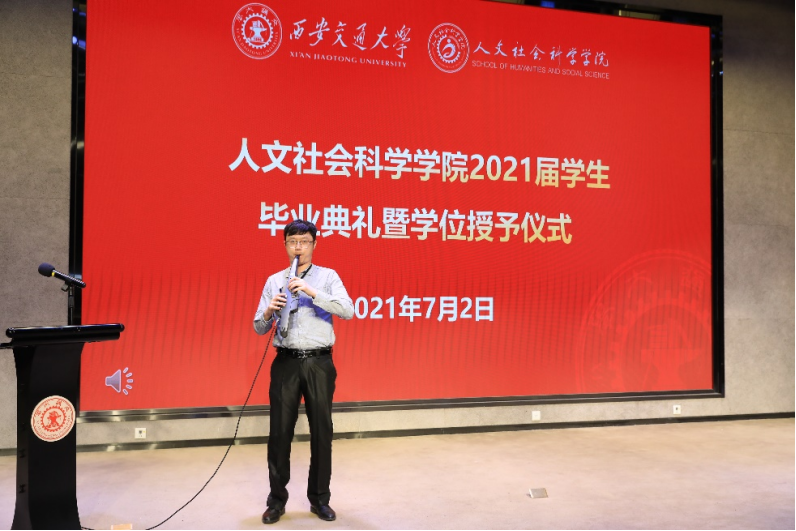 韩鹏杰教授作为教师代表,向同学们致以寄语。2021届毕业生是幸运的一代,生于改革开放之后,但依然成长于红旗之下。学院的每一位老师,都希望同学们初心如磐、使命在肩,从百年党史中汲取养料,主动投身到伟大事业的建设中;果毅力行,实干笃行,以实干的精神做到凡事有交代、件件有着落、事事有回应;终身学习,劳逸结合,将厚重的传统历史文化、革命的红色文化以及我们西安交大的西迁精神终身运用。最后,祝福大家无论走得多远,经历得再多,也能够天涯踏尽红尘,依然一笑作春温,归来仍做少年游!