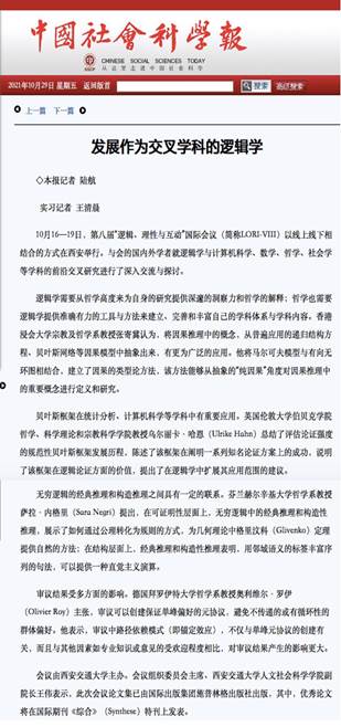 由中国社会科学院主管主办、中国社会科学杂志社编辑出版,面向全国理论界、学术界的大型理论、学术报纸《中国社会科学报》于2021年10月29日在第A03版“国际资讯”版面以《发展作为交叉学科的逻辑学》为题对本次会议进行了学术报道,并在中国社会科学网同步发布。