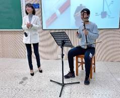 在作品鉴赏环节,文茹老师还邀请了我校电气专业大一的同学王子畅为大家现场作二胡演奏展示,让同学们零距离的感受二胡这件中国传统乐器的音色与丰富的演奏技巧。除了演奏二胡协奏曲《长城随想》音乐主题之外,王同学还现场演奏了二胡经典作品《赛马》《兰花花叙事曲》《风居住的街道》等作品的片段,多角度展示了这件乐器的独特魅力,课堂上同学们的热烈掌声不断响起。