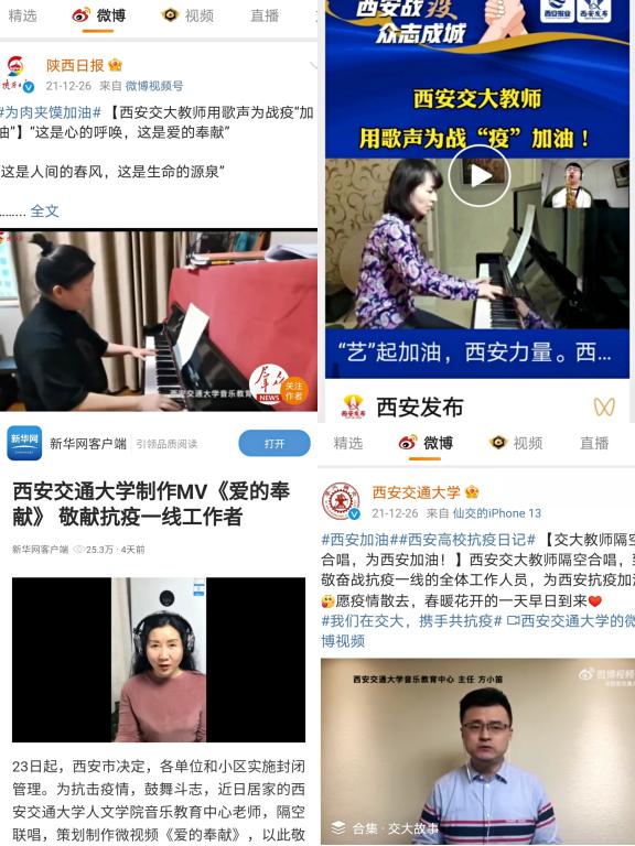 作为承担学校文化建设重点任务的单位,以文艺创作为抗疫加油是重大的政治责任。音乐教育中心教师联合校内师生隔空创作表演歌组曲:《爱的奉献》《长安永安宁》《光·明》,用歌声表达了对抗疫一线工作人员的敬意,对全市人民齐心抗疫的心声,和对这座千年古城的祝福,作品在各大网络平台发布后点击量快速突破30多万次。中国书法系举办“以艺通心,艺同抗疫”书法作品网络展,引导师生创作书法作品,以文化人,以艺通心,助力抗疫。艺术系教师通过引导学生创作海报、抗疫头像、日常空间再设计等方式,配合学校做好疫情期间的宣传与设计工作,传递抗疫暖心正能量。社会心理学研究所王瑜萍副教授撰写抗击疫情科普小贴士,引导师生服务大局,科学防疫。黑料网