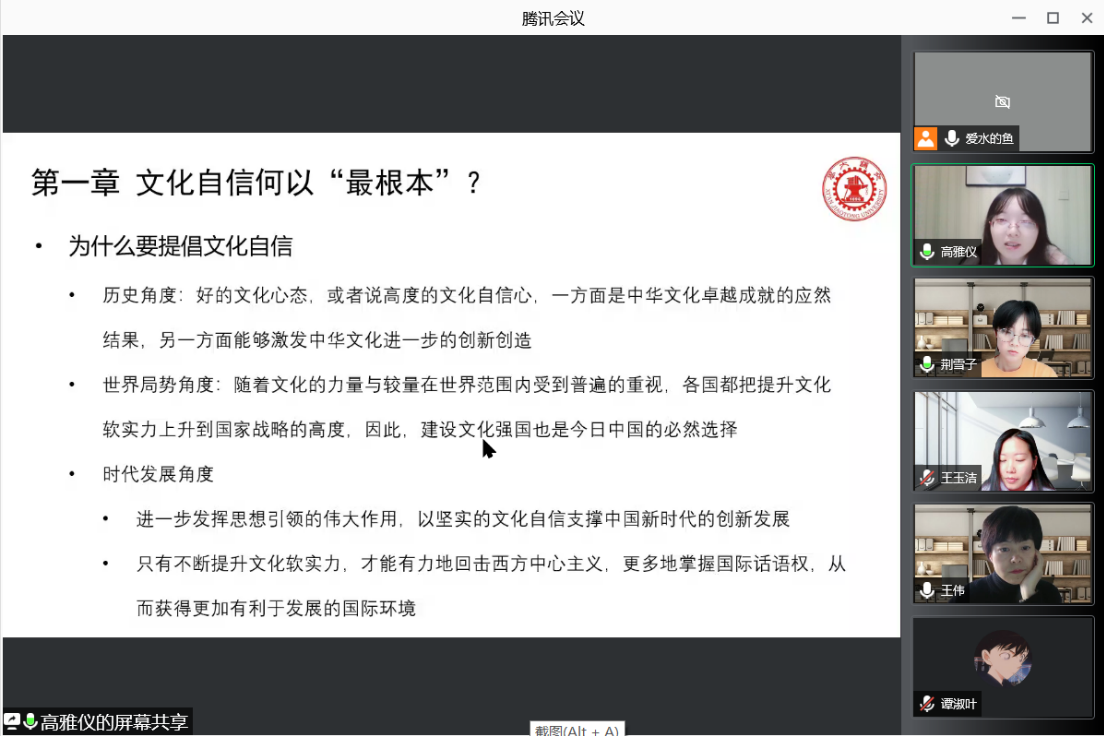 读书会由高雅仪、王玉洁和樊晋铭三位同学共同领读沈壮海等著的《文化何以自信》。高雅仪从第一二章的文化自信何以“最根本”及文化自信的底气从何而生进行论述分享。文化自信是中国特色社会主义道路自信、理论自信、制度自信的深层底蕴,同时,文化自信是中国特色社会主义道路自信、理论自信、制度自信的鲜活表达。中国优秀传统文化的深厚积淀、中国特色社会主义文化的繁荣兴盛、当代中国发展的耀世成就和不断增强的文化自觉都给了我们文化自信的十足底气。