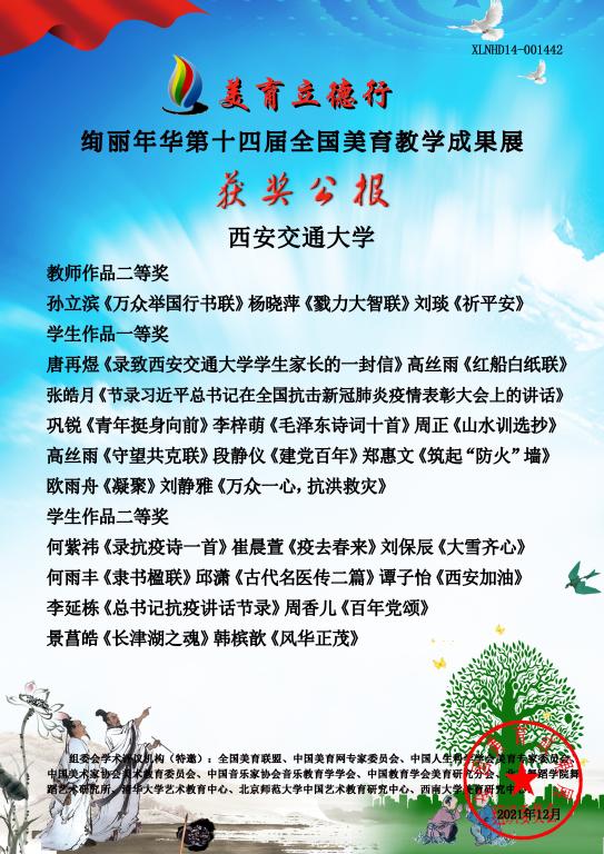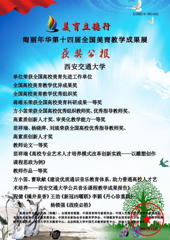 在2021年12月结束的“绚丽年华第十四届全国美育教学成果展”中,我校荣获“全国高校美育先进工作单位”、“全国高校美育教学优异成果奖”、“全国高校美育教学优秀组织奖”。蒋维乐获科研成果一等奖;苗祥瑞获论文一等奖;方小笛、曹耿献、程健、王劲、李颖、杨锁强等师生获作品一等奖;孙立滨、杨晓萍、刘琰等师生获作品二等奖。
