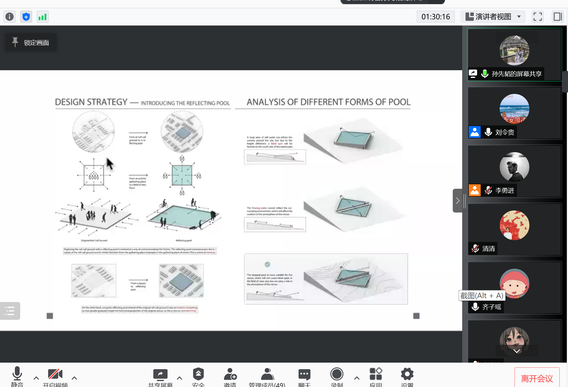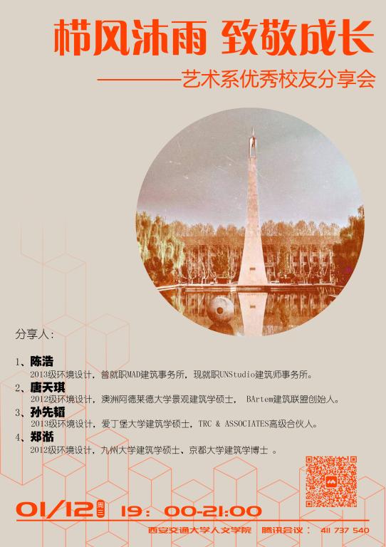 首日进行分享的校友包括陈浩(2013级环境设计专业,曾就职MAD建筑事务所,现就职UNStudio建筑师事务所)、唐天琪(2012级环境设计专业,澳洲阿德莱德大学景观建筑学硕士,BArtem建筑联盟创始人)、孙先韬(2013级环境设计专业,爱丁堡大学建筑学硕士,TRC&ASSOCIATES高级合伙人)、郑湉(2012级环境设计专业,日本九州大学建筑学硕士、京都大学建筑学博士)。