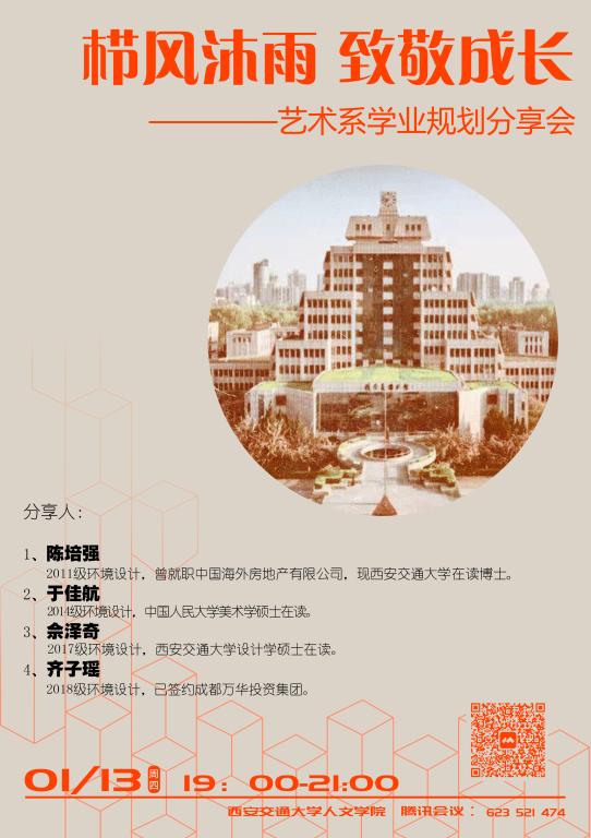次日,举行应届毕业生和几个优秀校友的经验分享,包括佘泽奇(2017级环境设计专业,西安交大设计学硕士在读)、齐子瑶(2018级环境设计专业,已签约成都万华投资集团)、于佳航(2014级环境设计专业,中国人民大学美术学硕士在读)和陈培强(2011级环境设计专业,曾就职中国海外房地产有限公司,现黑料网