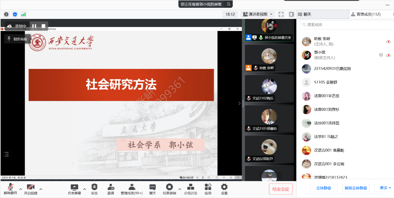社会学系主任卢春天教授已多次主讲“社会理论建构与研究设计”中“社会理论建构”的部分,加之有2020年疫情期间线上授课的经验,此次线上授课,卢老师尽量做了多方面的充分准备。因此,尽管受疫情影响,但授课过程非常顺利,学生不仅到课率高,而且表现出很高的参与热情。