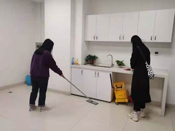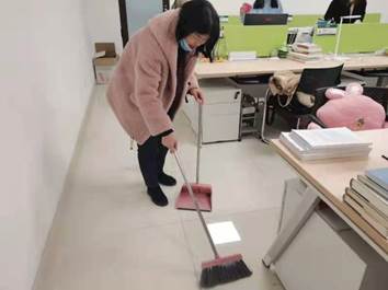 研究生党支部同学们主动拿起扫帚、拖把、抹布等清洁工具,在涵英楼工位和教研室开始了清洁工作,大家明确分工,合力清扫,共同创建整洁的学习环境。