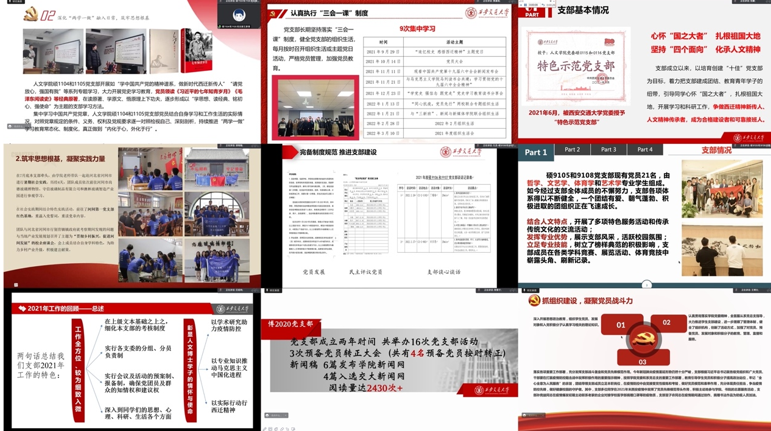 孔芸对硕9106和9107党支部一年的工作进行汇报,该支部党员在科研、实践等各方面都取得了优异成绩。硕9105和9108党支部积极发挥专业优势,疫情期间,支部党员通过书写抗疫散文、书法作品等方式为西安加油。