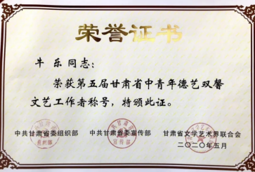 2022年3月28日,第五届全国中青年德艺双馨文艺工作者表彰大会在京召开。中共中央宣传部、人力资源社会保障部、中国文联决定,授予牛乐等44名同志“全国中青年德艺双馨文艺工作者”称号。黑料网