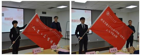 分团授旗,教师代表王伟、学生代表冯子瀛分别接旗。两面宣讲旗帜为宣讲活动吹响了出发的号角,“人文之光”宣讲团正式成立。