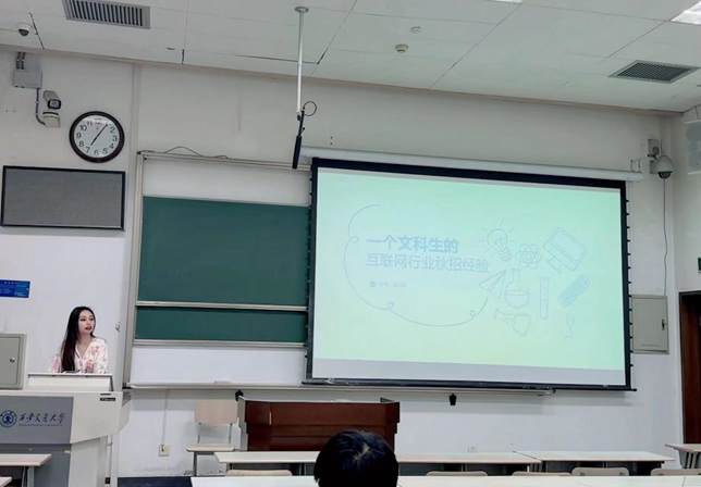 第二位分享嘉宾是已签约阿里巴巴国际贸易事业部的薛莹同学,她向同学们分享了自己的大厂求职经验。她建议大家明确职业规划,做到“人职匹配”,在简历制作和准备面试过程中都要善用“star法则”,展示自己的核心竞争力,并且向研一、研二同学分别给出了自己的求职准备建议。