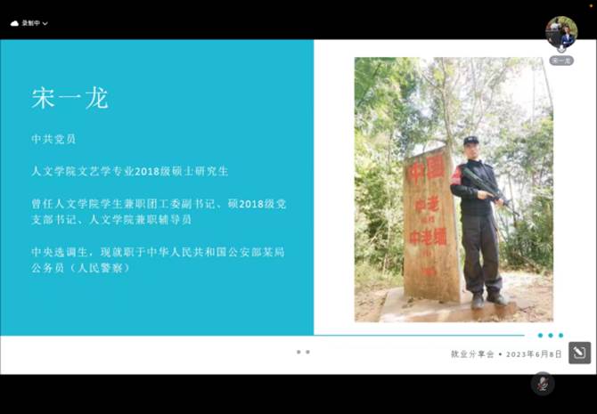 国家公务员宋一龙线上讲述了自己作为基层工作人员的经历,从精神状态、心理状态、理性规划、提前准备四个方面出发,强调同学们应当摆脱学生思维,明确自己从学生身份到工作人员身份的转变。同时他还提到应当真正热爱选调工作,这样才能积极面对工作中遇到的困难,从挫败感中成长。宋一龙还向大家推荐了自己热爱的书籍,希望能为大家提供帮助。