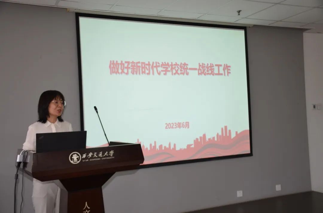党委统战部副部长邢旭宁以“做好新时代学校统一战线工作”为题进行报告。邢旭宁副部长立足自身工作岗位和工作经验,讲解了如何在新时代背景下发挥好统一战线的独特优势和作用,指出该工作的目的在于凝聚各方力量,共同发挥作用,推动学校事业持续发展。邢旭宁副部长详细介绍了习近平总书记关于做好新时代党的统一战线工作的重要思想,她从“十二个必须”的核心内容出发,强调“十二个必须”是新时代统战工作的根本指针,各级党委必须完整、准确、全面贯彻落实。为了有效地开展学校统一战线工作,邢旭宁副部长对二级单位党委落实好学校统战相关工作责任提出了要求。