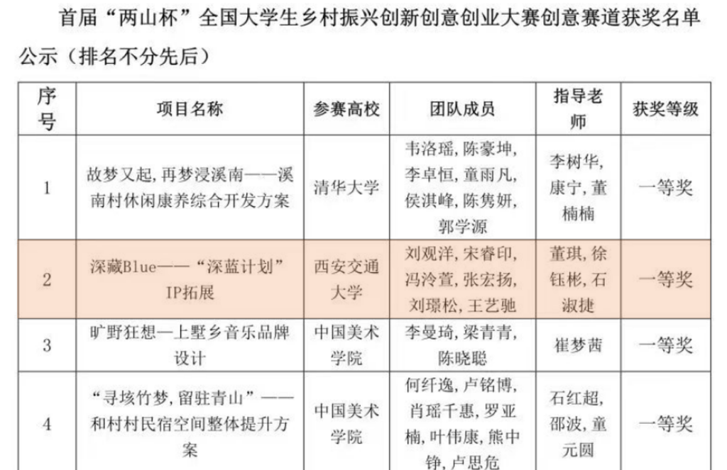 10月13日,由新华通讯社主办,湖州市安吉县、新华社品牌工作办公室、新华社浙江分社承办的首届“两山杯”全国大学生乡村振兴创新创意创业大赛在浙江省安吉县举行闭幕仪式。由人文社会科学学院董琪,徐钰彬、石淑捷三位老师指导,刘观洋、宋睿印、刘璟松、冯泠萱、张宏扬同学参赛的队伍,凭借“深藏BLUE——‘深蓝计划’IP拓展”项目,在来自国内外253所高校的915支团队中脱颖而出,荣获全国一等奖。