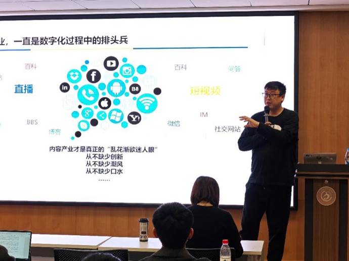 讲座伊始,龚继武指出当前有限的人工力量难以胜任对巨量互联网信息的处理,强调在自媒体时代建立基于AI的信息处理流程的重要性。进而,龚继武围绕用户画像与内容理解这两大板块,描画内容推荐的运作场景,剖析热点新闻的打磨技巧,鲜活生动的案例与妙趣横生的语言令在座的同学收获满满。最后,龚继武结合自己在知乎的工作经历,对知乎平台的信息生产流程和项目运营模式进行了详细讲解。