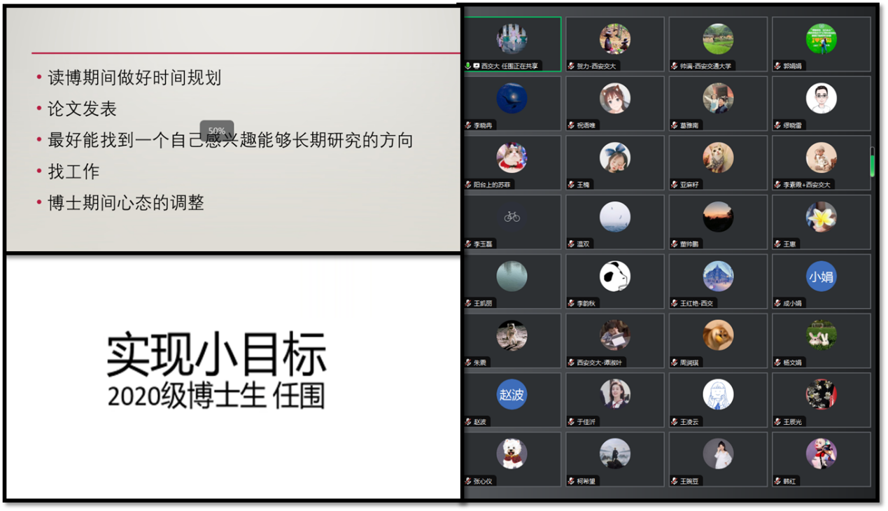任围博士从心态调整、论文写作和找工作三个方面分享自己的心得。关于心态,她建议少想多做,减少内耗。焦虑、自我怀疑是博士期间常见的心理状态,适当调整将其转化为行动的动力将会提升工作效率,增加产出。关于论文写作,她认为百转千回不如落笔先写。每天坚持读文献、坚持写作,将想法转化为文字是有效的产出路径;论文投稿才是科研的第一步,将想法转化为可投稿的论文是科研中重要的准备工作。她的求职之路可以总结为“惊喜和意外并存”。在众多选择中,她最终选择了留在交大,在熟悉的环境中遇见惊喜,不忘初心,砥砺前行。