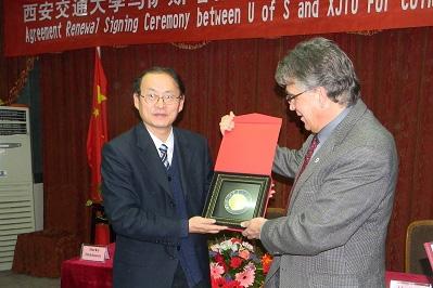 程光旭副校长在签约仪式上致辞,对加拿大萨斯喀彻温大学研究生院院长Lawrence Martz教授,文理学院院长Harley Dickinson,校长中国顾问、孔子学院院长宗力教授一行表示欢迎。程校长指出,近年来,在边燕杰院长的领导下,我校社会学专业发展迅速,成果丰硕,在科研和教学方面取得了长足的发展,在陕西乃至国内都产生了积极的影响。科研成果涉及社会发展的关切问题,在媒体上有广泛的报道。尤其是社会学学科在促进师生交流、人员互访方面也取得了积极的成效,希望各方通过共同努力,务实合作,推动第二轮协议的实施,我校将在社会学研究生联合方面给予充分支持。