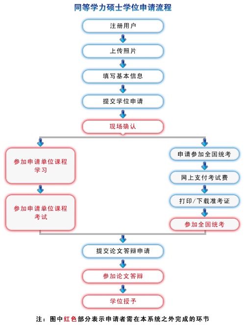 “全国同等学力人员申请硕士学位管理工作信息平台”作为全国统一的同等学力申请硕士学位工作信息管理和服务平台,旨在不改变国家管理部门和学位授予单位权责分工的前提下,通过现代化的信息服务体系,将同等学力申请硕士学位工作从提出(接受)申请、课程管理、考试管理至学位授予管理的全过程信息纳入全国统一信息平台进行管理,其申请流程如下: