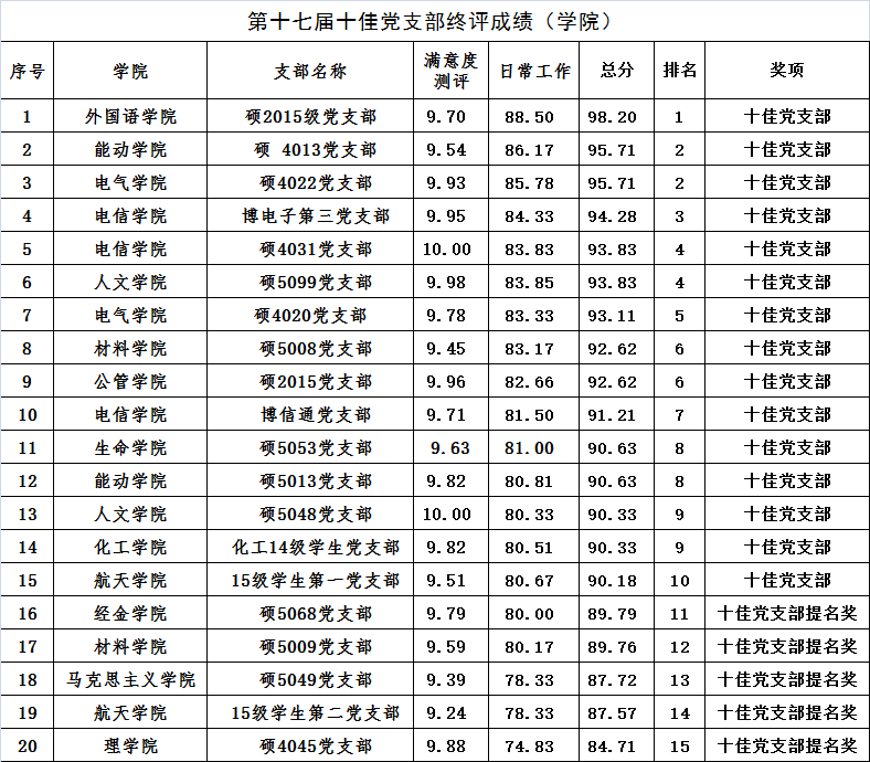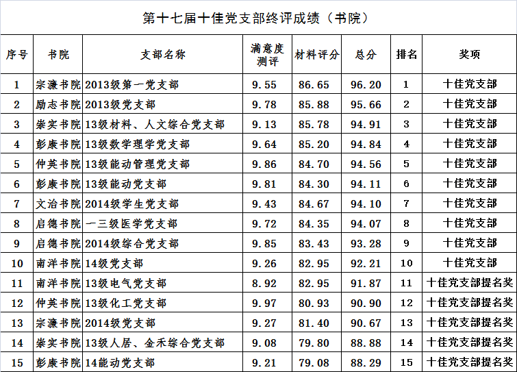 5月中旬,党委学工部集中对44个参赛支部,849名党员,1834名支部所在班级同学进行满意度测评,并邀请党委各部委领导、专家,根据《十佳党支部评分细则》,从支部内部建设、日常组织生活、工作成效等几个方面对参赛支部进行考核打分。现将终评成绩公布如下: